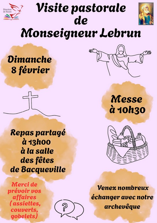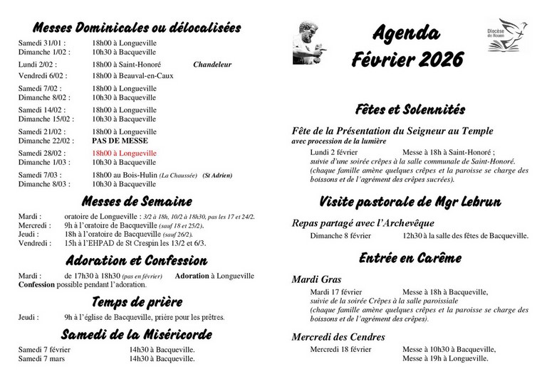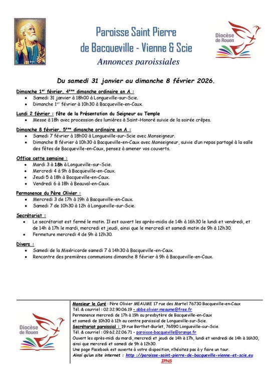 • Messe à 18h avec procession des lumières à Saint-Honoré suivie de la soirée crêpes.Dimanche 8 février, 5ème dimanche ordinaire an A :• Samedi 7 février à 18h00 à Longueville-sur-Scie avec Monseigneur. • Dimanche 8 février à 10h30 à Bacqueville-en-Caux avec Monseigneur, suivie d’un repas partagé à la salle des fêtes de Bacqueville-en-Caux, pensez à amener vos couverts.Office cette semaine :• Mardi 3 à 18h à Longueville-sur-Scie. • Mercredi 4 à 9h à Bacqueville-en-Caux. • Jeudi 5 à 18h à Bacqueville-en-Caux. • Vendredi 6 à 18h à Beauval-en-Caux. Permanence du Père Olivier : • Mercredi 3 de 17h à 19h à Bacqueville-en-Caux. • Samedi 7 de 10h30 à 12h à Longueville-sur-Scie. Secrétariat :• Le secrétariat est fermé le matin. Il est ouvert les après-midis de 14h à 16h30 le lundi et vendredi, et de 14h à 17h le mardi, mercredi et jeudi, ainsi que le mercredi et samedi matin de 9h à 12h30. • Fermeture mercredi 4 de 9h à 12h30. Divers :• Samedi de la Miséricorde samedi 7 à 14h30 à Bacqueville-en-Caux. • Rencontre des premières communions dimanche 8 février à 9h à Bacqueville-en-Caux. Monsieur le Curé : Père Olivier MEAUME 17 rue des Martel 76730 Bacqueville-en-Caux Tél. & courriel : 02.32.90.06.19 – abbe.olivier.meaume@free.fr