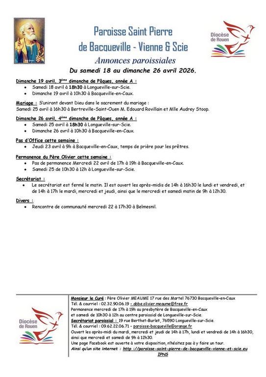 Dimanche 19 avril, 3ème dimanche de Pâques, année A : • Samedi 18 avril à 18h30 à Longueville-sur-Scie. • Dimanche 19 avril à 10h30 à Bacqueville-en-Caux.Mariage : S’uniront devant Dieu dans le sacrement du mariage :• Samedi 25 avril à 16h30 à Bertreville-Saint-Ouen M. Edouard Rovillain et Mlle Audrey Stoop. Dimanche 26 avril, 4ème dimanche de Pâques, année A : • Samedi 25 avril à 18h30 à Longueville-sur-Scie. • Dimanche 26 avril à 10h30 à Bacqueville-en-Caux.