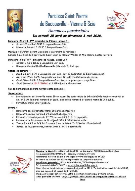 Permanence du père Olivier • Pas de permanence Mercredi 22 avril de 17h à 19h à Bacqueville-en-Caux. • Samedi 25 de 10h30 à 12h à Longueville-sur-Scie. Divers :• Rencontre de communauté mercredi 22 à 17h30 à Belmesnil.