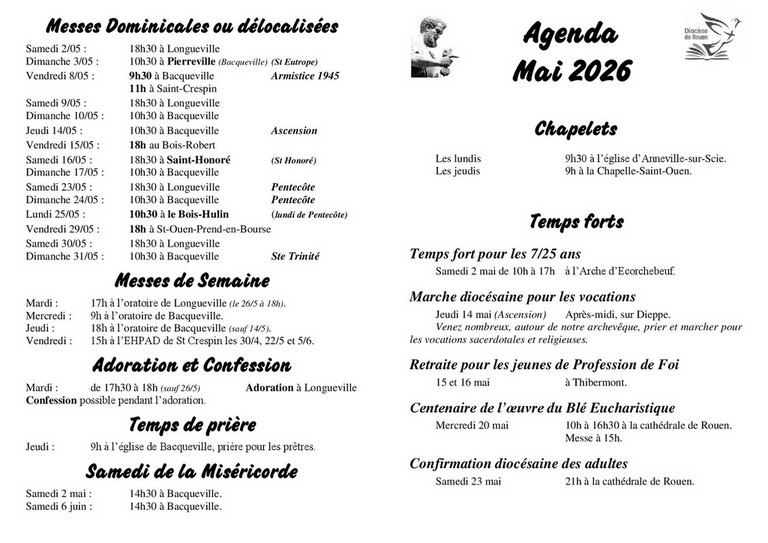 Du samedi 18 au dimanche 26 avril 2026.Baptêmes : deviendront enfants de Dieu par le sacrement du baptême : • Samedi 18 avril à 16h30 à Bacqueville-en-Caux Maëlle Trohaye, Milann et Mia Pimont.
